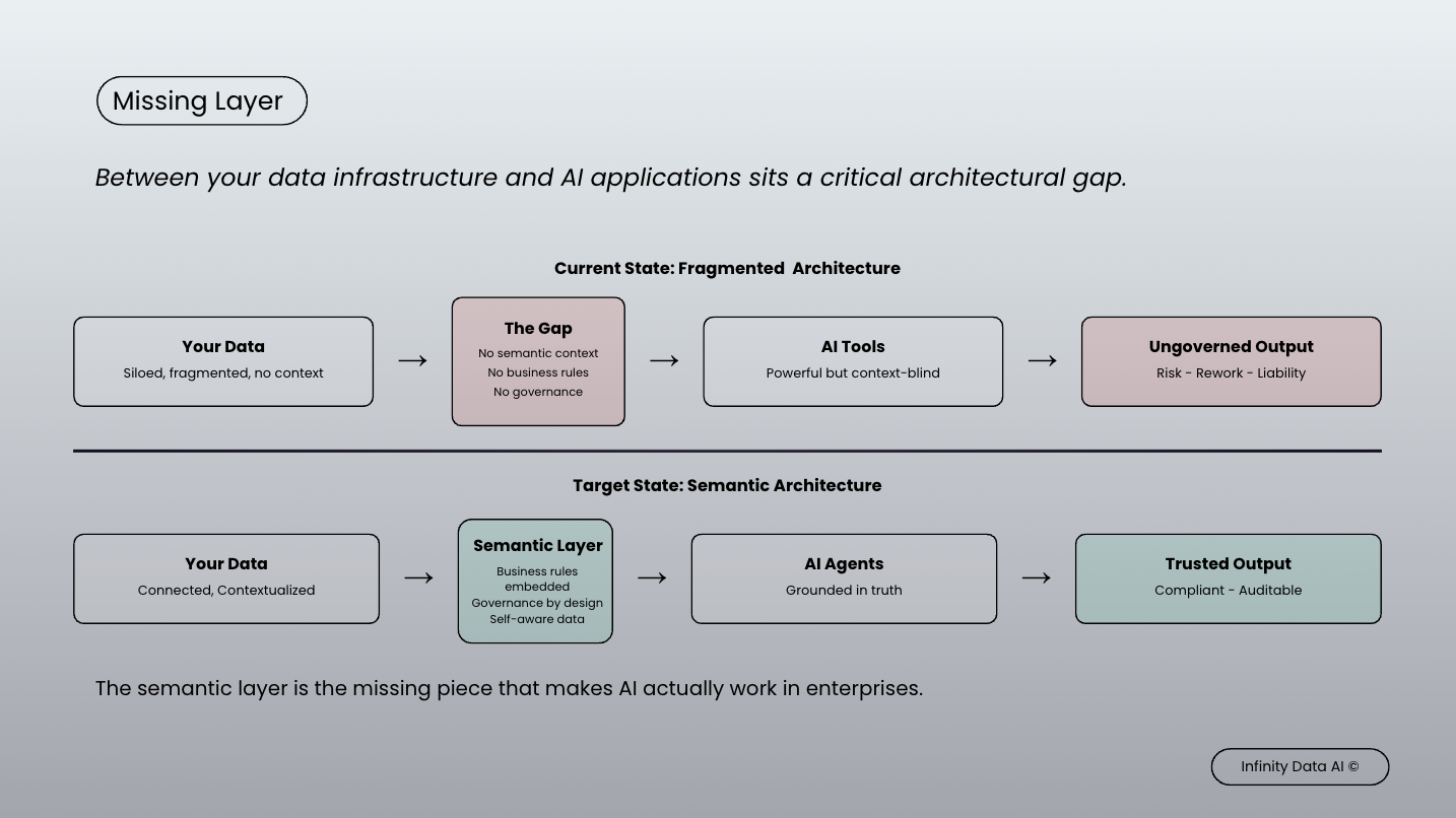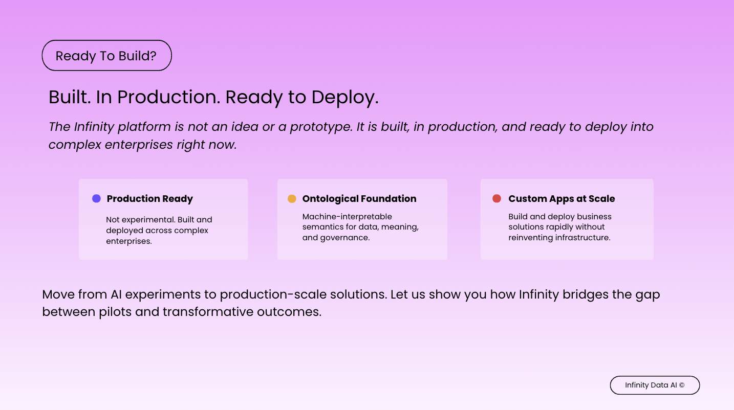 Enterprises are not failing at AI because of models, but because of the data, architecture, and operating models those systems depend on. Infinity Data AI is the semantic operating system for the AI era, closing the AI Transformation Gap between pilots and production.Infinity wraps your existing data with meaning, rules, relationships, and constraints, creating an ontological, AI‑native foundation that applications and agents can trust out of the box.